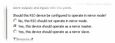 In mirror mode, one RIO device is configured as a "mirror master" and one or more RIO devices are configured as "mirror slaves". Master inputs and outputs can be mapped to slave outputs and inputs with this pane.