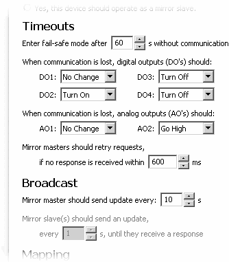 For best results, we recommend that the mirror timeout be set to at least twice the mirror broadcast value. This will prevent outputs from entering the emergency shut-down state in the event of a single packet loss.
