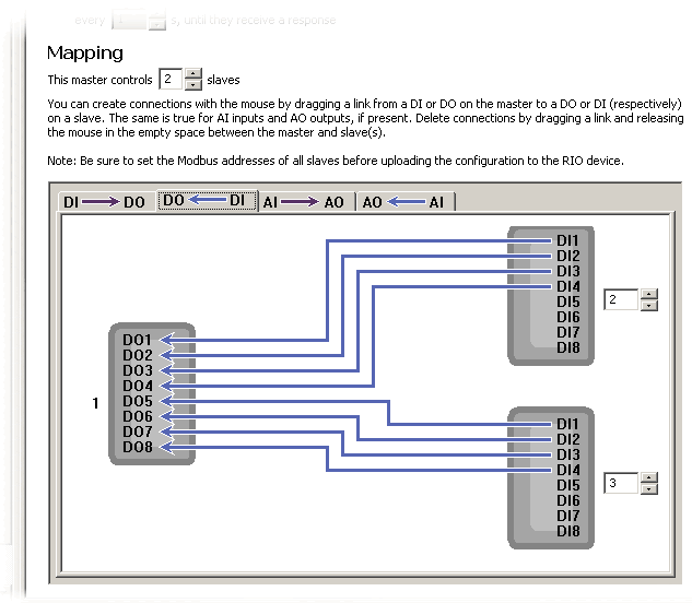 Finally, let's hook up the full indicators by dragging a connection from the mirror master's DO1 to the top mirror slave's DI1 and from the mirror master's DO2 to the bottom slave's DI2. Scroll the mirror pane all the way to the top and click on the button labelled "Upload New Settings" to save your changes.