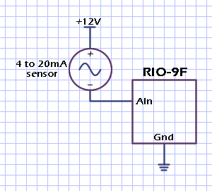 Analog inputs can sense a range of 4 to 20 mA. Here is a typical configuration that uses the analog input to monitor the current through a sensor.